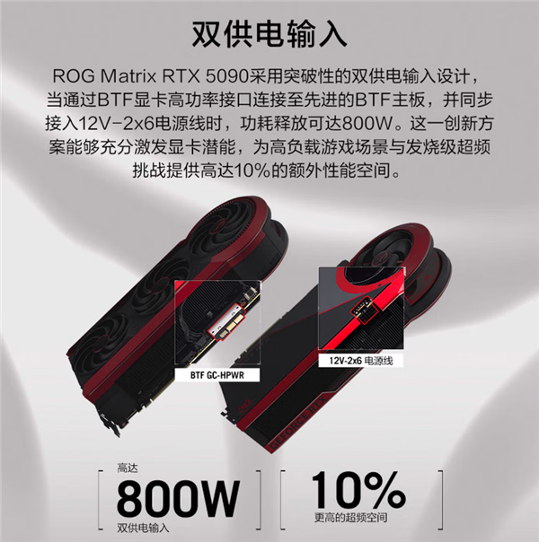 作为华硕显卡旗舰之作,该卡基于RTX 5090D V2核心,采用BTF双供电输入设计,配合BTF背插主板与12V-2x6电源线可解锁800W超频模式。