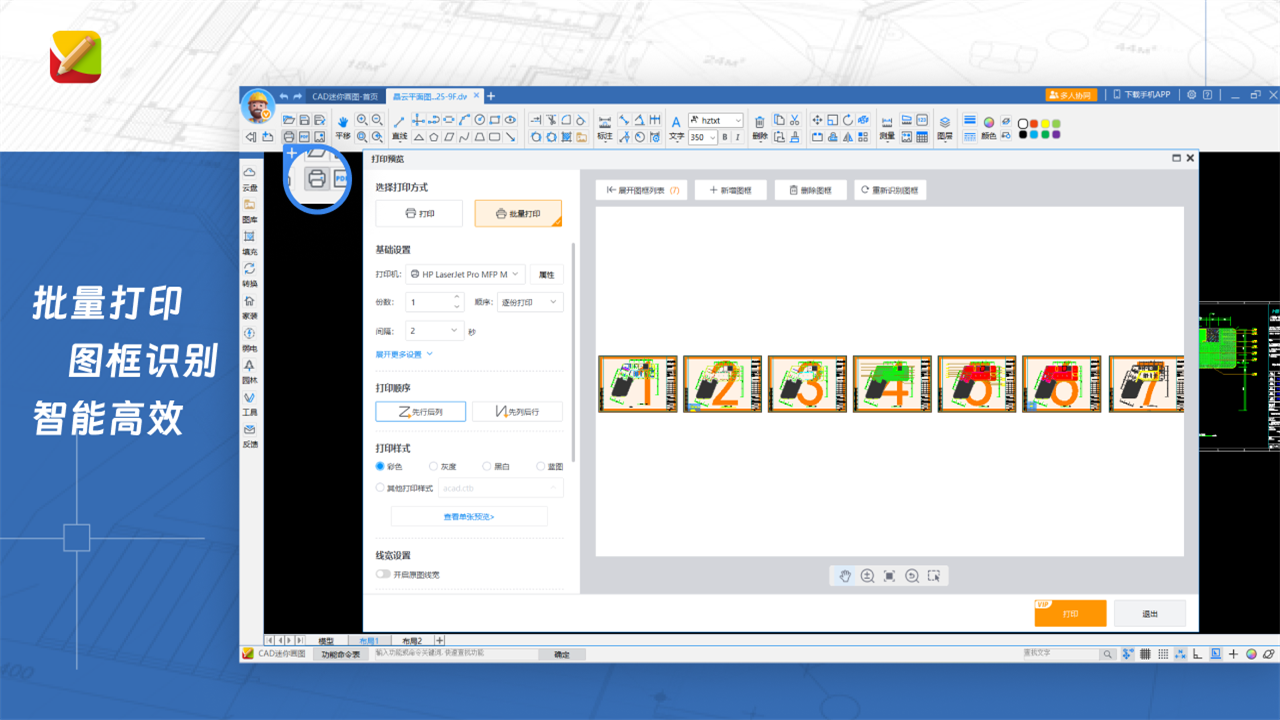 智能识别图框功能是专为提高图纸处理效率而设计的。只需一键操作,软件就能准确识别图纸中的图框。基于此功能,我们还支持批量打印、转 PDF 和图片。这意味着您可以一次性处理大量的图纸,无论是打印出图、转换为 PDF 文件还是生成图片,都无需逐个操作,大大节省了时间和精力,尤其适用于需要处理大量图纸的项目,如大型建筑工程、复杂机械设计等。