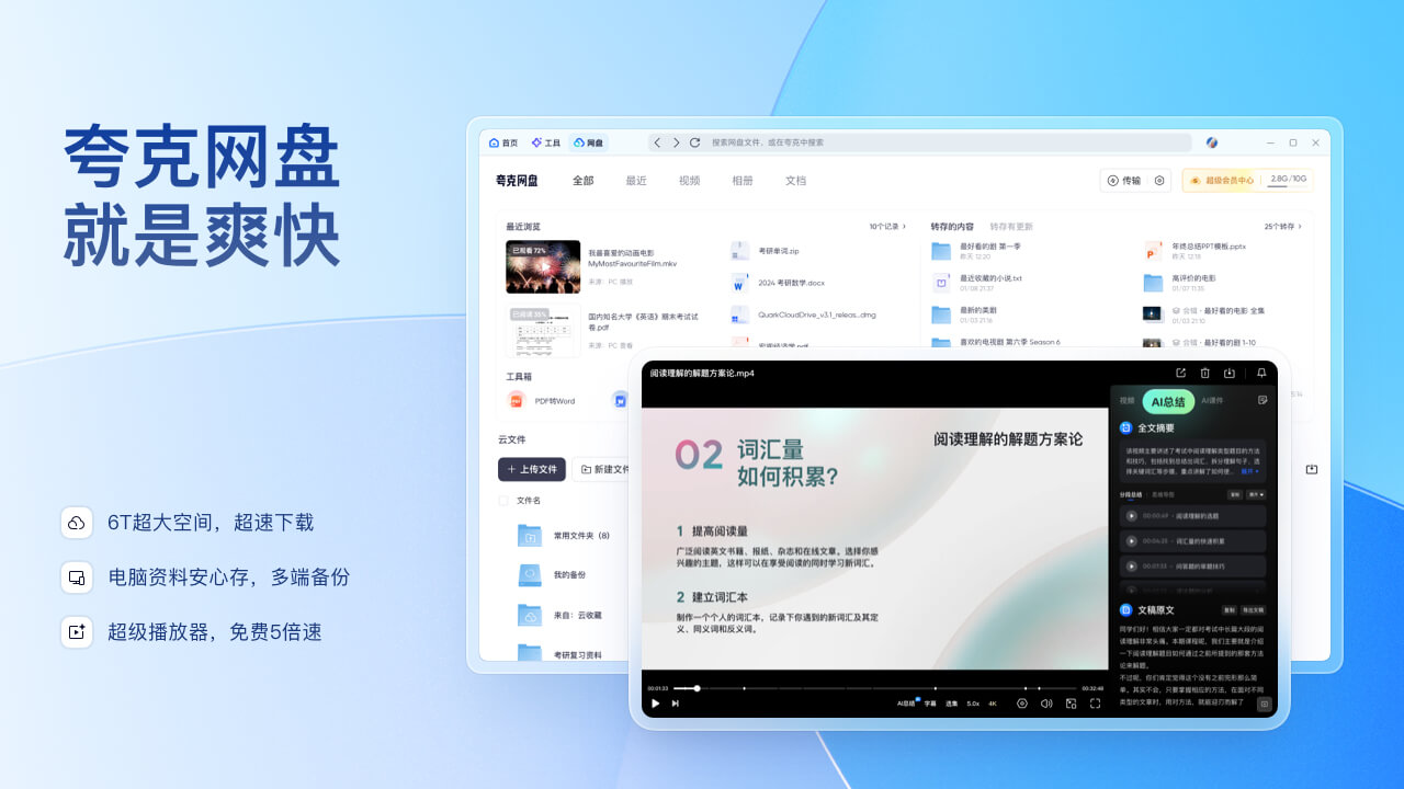 4、夸克网盘,畅享海量存储与极速下载:拥有高达 6T 的超大存储空间,足以容纳您工作、学习、生活中的海量电脑资料,无论是珍贵的照片视频、重要的文档数据,还是大型的软件安装包,皆可安心存储于此。其超速下载功能更是令人惊叹,无论文件大小,都能以极快的速度传输至您的设备,让您无需漫长等待。多端备份功能确保您的数据在不同设备间无缝同步,随时随地均可访问。而超级播放器不仅支持多种格式文件播放,还提供免费 5 倍速播放功能,满足您多样化的观看需求,无论是学习课程视频加速复习,还是休闲娱乐快速浏览,都能随心掌控节奏。