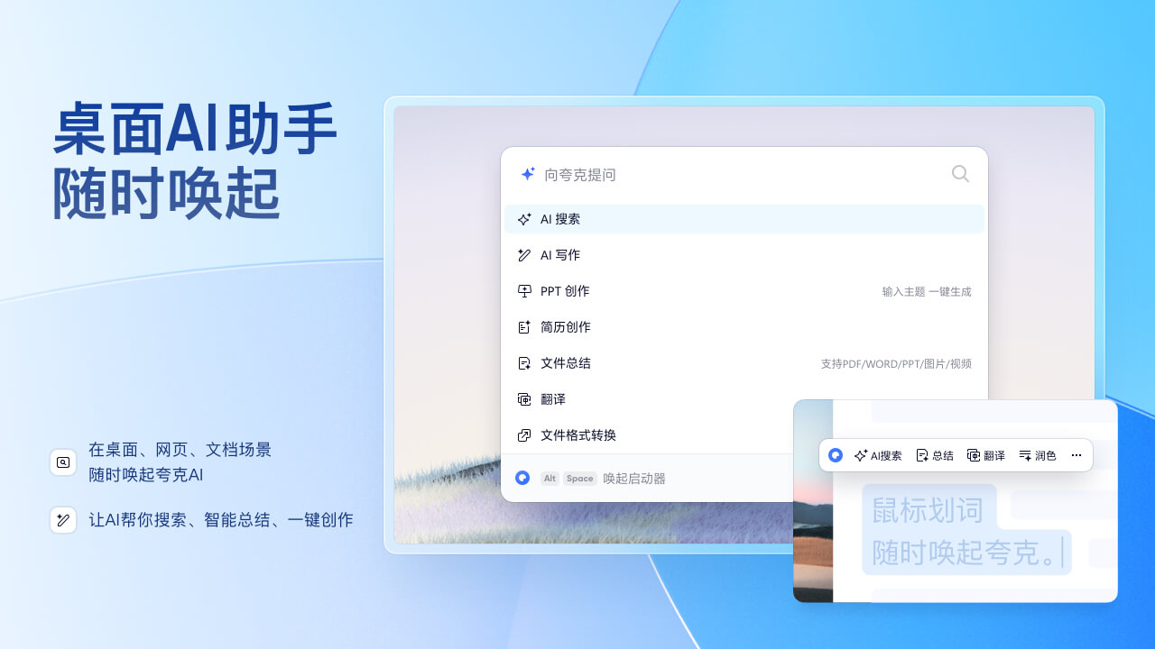 桌面AI助手,随时唤起 在桌面、网页场景随时唤起夸克AI,AI帮你搜索、智能总结、一键创作,任意划词让AI帮你解读、翻译、润色