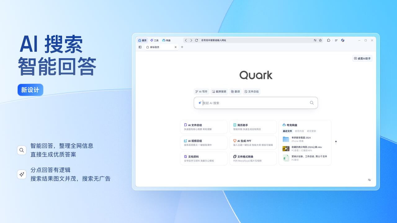 夸克电脑版这是来自阿里巴巴旗下神马搜索专门为广大搜索用户推出的一款精简极速搜索品牌夸克的PC版客户端软件,夸克电脑版全方位整合AI功能,将Ai融入写作、办公、创作等诸多领域,帮助使用者们极大的提升了使用效率,夸克电脑版通过诸多AI功能和诸多终端软件实现文档和收藏夹以及诸多内容的多端实现云端合一。