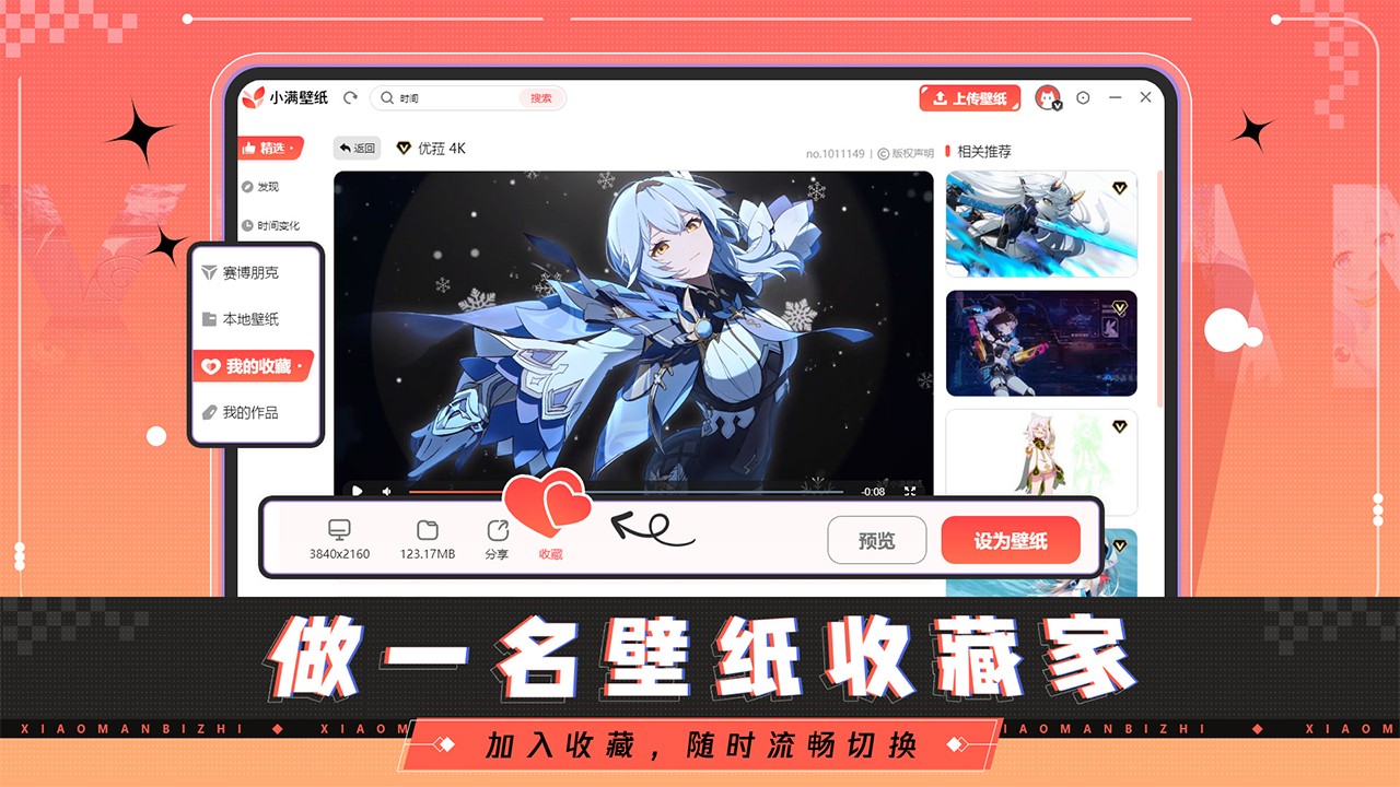 小满壁纸电脑版这是一款主打二次元特色的电脑端桌面壁纸软件,小满壁纸电脑版为主多游戏玩家们和网友们提供2K和4K个高清的壁纸图片,无论是动态的还是静态的你都可以找到最新的高清晰壁纸资源!小满壁纸电脑版各种风格任你选,无论是游戏、二次元、动漫、影视、风景、赛车还是田园等等诸多系列,总有一个你喜欢的哦!
