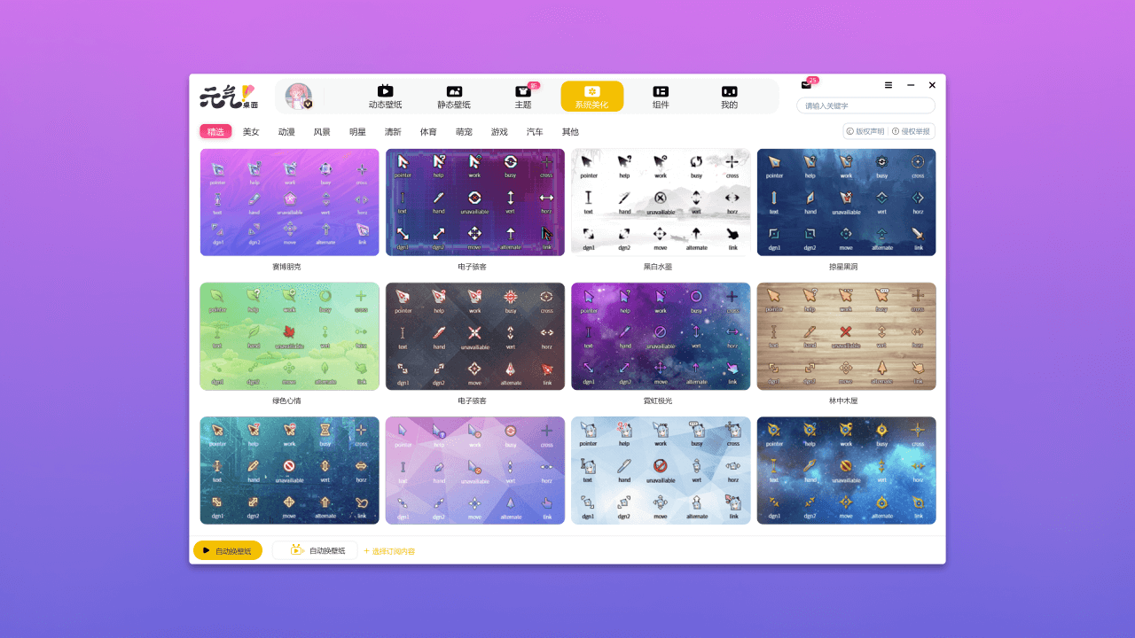 元气桌面壁纸除了动态桌面和壁纸功能之外,还拥有鼠标和任务栏梅花等诸多功能,你只需要选择你喜欢的主体就可以一键美化你的鼠标样式哦!元气桌面壁纸还可以修改任务栏和状态栏,元气桌面壁纸还支持桌面整理功能,帮助你将你的桌面分门别类,整洁而条理清晰。
