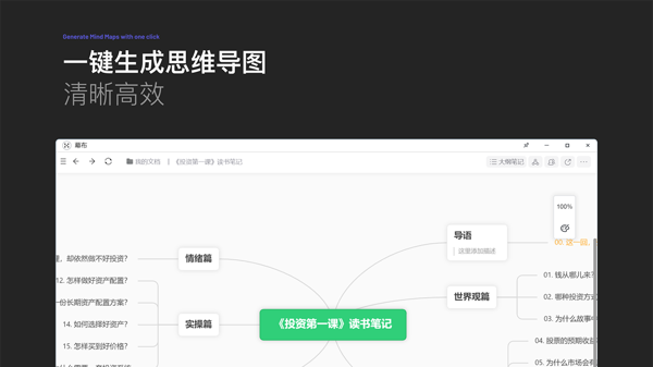 快速梳理思路,一键生成思维导图。通过培养结构化思维方式,你可以不断拆解和细化每个主题,释放更多创意。便捷的分享和展示功能,助你轻松进行思维碰撞与头脑风暴。