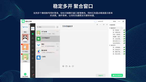 稳如磐石,永不掉线:各个微信账号都能持续平稳运行,卡顿、闪退、掉线这些恼人的状况通通不见,全程为用户营造丝滑流畅的使用感受,让多账号沟通毫无后顾之忧。