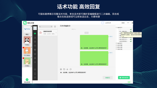 便捷操作,极速发送:使用起来更是得心应手,鼠标悬停时,完整话术即刻清晰呈现;单击就能把话术摘抄进编辑框,按需二次编辑;双击或者轻点发送按钮,话术瞬间发出。