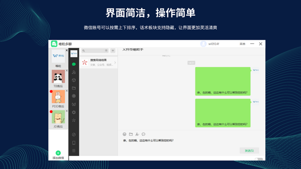 聚合式窗口,一键速切:把多个微信账号的聊天窗口整合在同一界面,用户只需轻松一点,就能在不同账号间迅速切换聊天窗口,让多账号管理告别混乱,沟通节奏尽在掌握,大大缩减了在不同客户端频繁切换所耗费的时间成本。