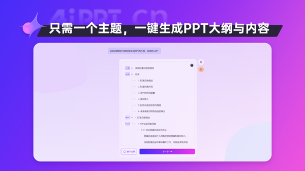 一键速生 PPT:当灵感闪现或是任务紧急,只需轻松键入主题、关键词或是关键要点,AiPPT 便能迅速激活其智能引擎。它会精准匹配契合主题的模板,调用海量优质素材,同时完成精妙排版。