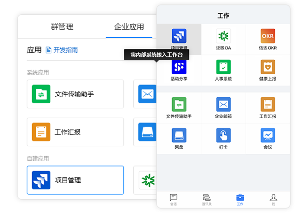 协同办公便捷高效:提供公告、网盘、汇报、自定义菜单、待办、打卡等一系列协同办公功能,并且支持与 OA、CRM、ERP 等其他企业应用进行集成,实现数据的互通互联。