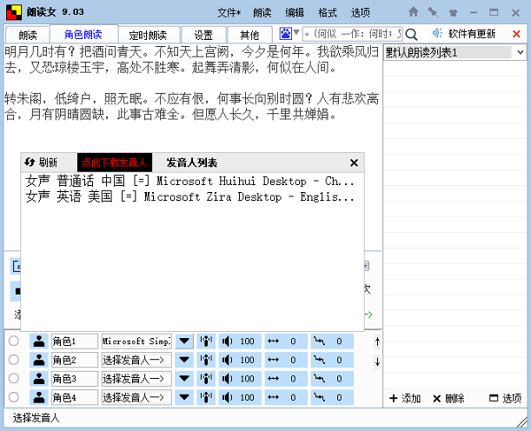朗读女默认调用系统自带语音,能满足用户基本的朗读需求。更为出色的是,它支持附加语音库,用户可根据自己的喜好,从网络上下载不同的语音库。
