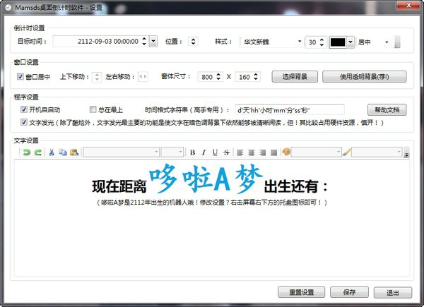 Mamsds桌面倒计时软件是一款计算机桌面显示倒计时工具,能够让用户直观的查看时间日期,可以提醒重要事情任务,Mamsds桌面倒计时电脑版以悬浮窗的形式显示在桌面上,用户的可以自定义窗体的位置、大小和透明度等。
