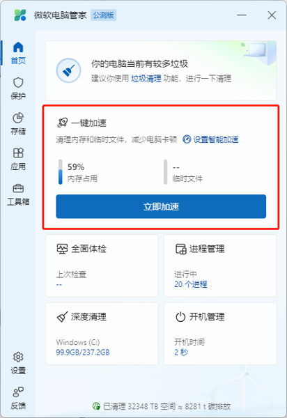 全面体检:一键即可检测电脑当前健康状态,涵盖电脑主要垃圾路径检查、开机启动项优化、常规缓存路径的病毒检测,以及部分系统异常项检测等,帮助用户快速了解电脑的整体状况,及时发现并解决潜在问题 。