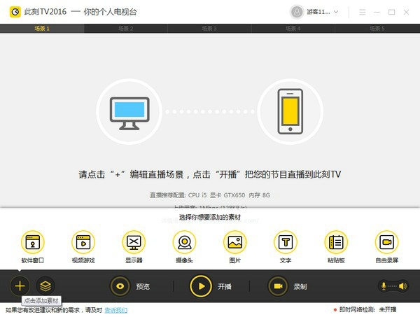 此刻TV电脑版是一款功能强大的直播录制软件,此刻TV客户端直播源接入全面,支持录屏、游戏窗口、应用程序、摄像头、图片、文字、粘贴板等六大类素材导入,多数游戏与软件均可直接转化为直播画面,支持多场景编辑与自由切换,素材可拖拽调整位置、大小与视角,轻松打造个性化直播画面。