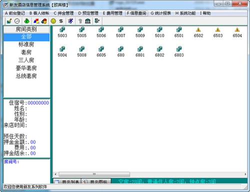 新友酒店信息管理系统能够实时更新客房状态,帮助酒店管理者掌控房间资源,涵盖从前台管理到财务核算等全面功能,满足酒店各类管理需求。