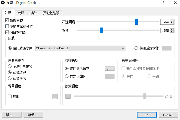 支持对字体、背景色、纹理、透明度以及时钟大小等元素进行个性化设置,用户可根据电脑字体库选择字体,还可以使用纯色、自定义图片或者软件自带的 210 张高清纹理壁纸来填充背景。