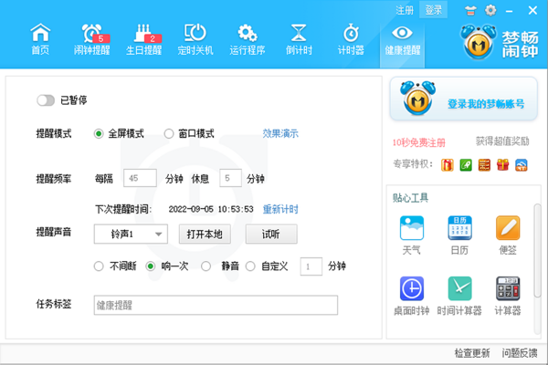 梦畅电脑闹钟电脑版是一款高效实用的时间管理工具,梦畅电脑闹钟2025最新版可以设置不同类型的闹钟提醒,支持设置不同的提醒方式,能够根据需要设置提醒内容、标题、提醒声音等,用户可以上传自定义铃声或选择内置的铃声。