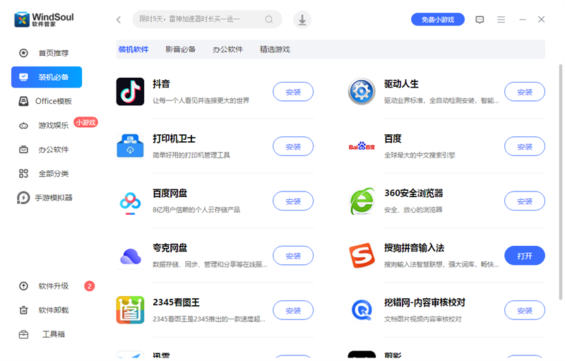 风灵软件管家(WindSoul 软件管家)这是一款为Windows系统用户推出的一款电脑软件管理应用,WindSoul全方面支持正版免费软件和付费软件的在线安装,拒绝 “盗版”“捆绑”“全家桶”,所有软件均接受严格审核,不含盗版、破解版、病毒软件,确保用户能省心安装使用。