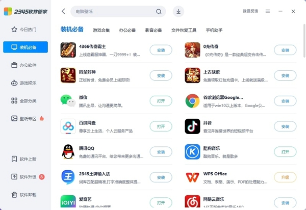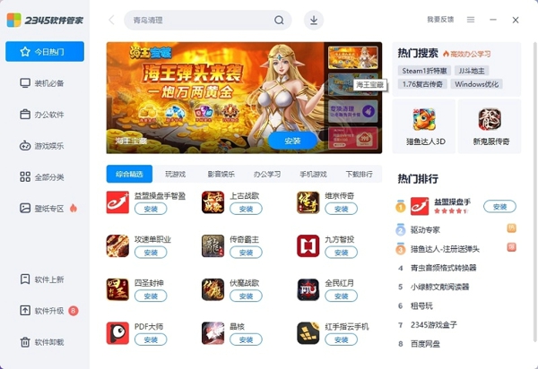 2345软件管家2025最新版是一款集成应用商店管家,这里提供了超多丰富的应用资源,2345软件管家电脑版提供了软件安装、更新、卸载等服务,能够为用户提供便捷的应用软件管理,可以对已装的应用进行更新、清理等操作。