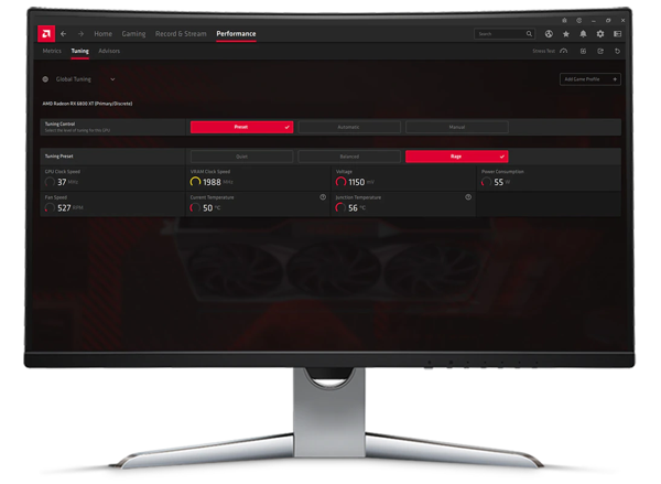 内置针对特定显卡的性能预设,比如适配 Radeon RX 6800 和 RX 6900 系列的调节方案,其中 Rage 模式能让 RX 6800 XT 等高端显卡全力释放性能。