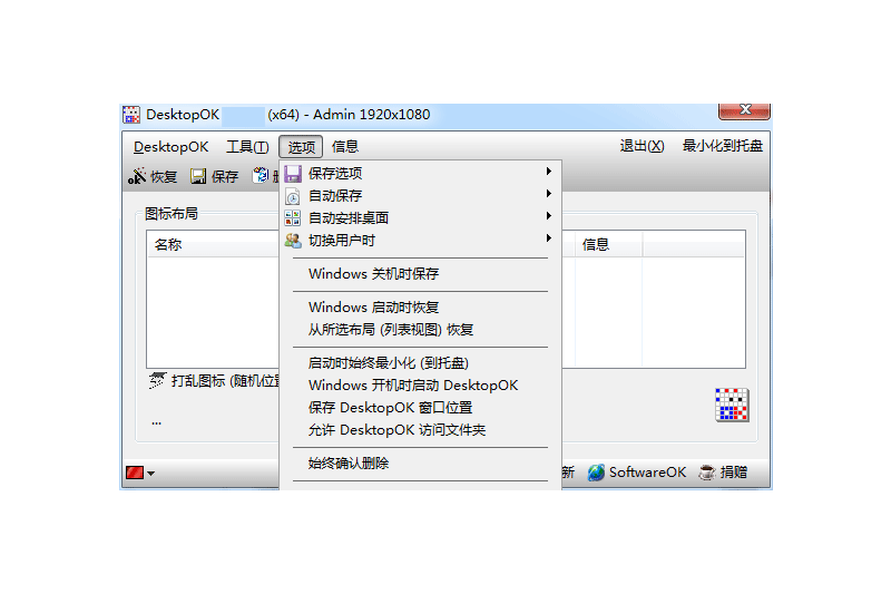 DesktopOK整体来说非常符合用户的保存桌面图标的需求,自动保存各类的图标位置,帮助用户整理出想要的图标位置,并且可以直接储存下来,还可以隐藏桌面图标。
