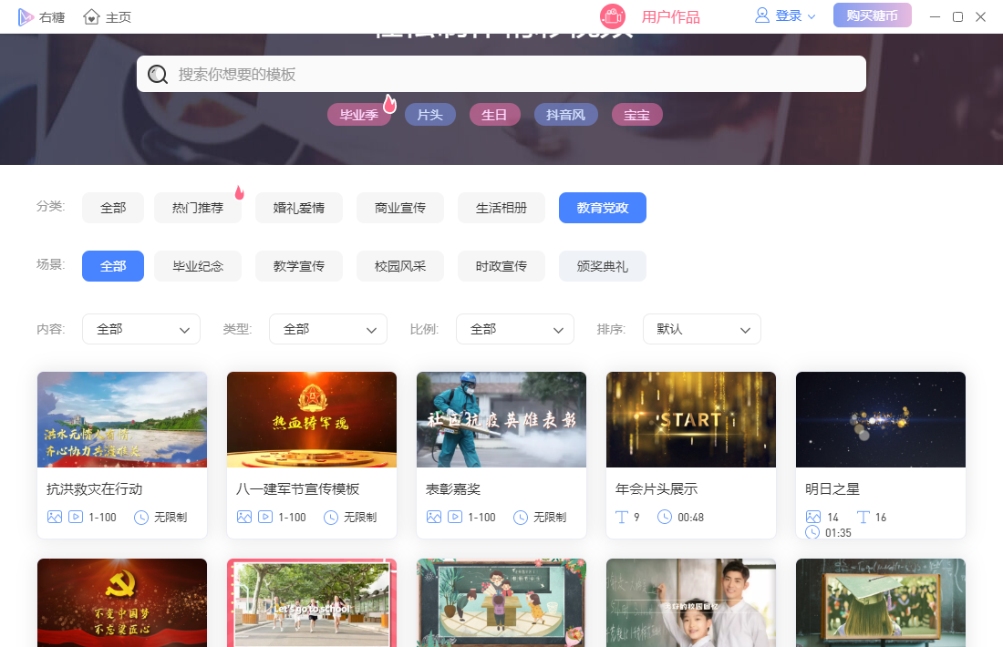 右糖之中用户可以直接导入素材文件到应用之中,在这里模板不少都是免费使用的,在使用了模板之后,用户可以单独对文字或者素材进行修改,让用户在使用模板的同时也加入自己的创意。