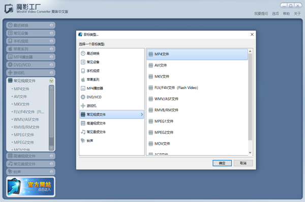 魔影工厂支持市面上几乎所有流行的视频格式,像常见的 AVI、MPEG 系列、RM、RMVB、WMV,以及 VCD/SVCD 对应的 DAT、VOB 格式,还有 MOV、MP4、MKV、ASF、FLV 等。