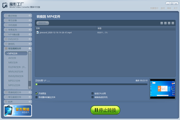 魔影工厂软件提供了较快的格式转换速度,能够快速完成视频格式转换,大文件转换也能保持较高的转换速度。