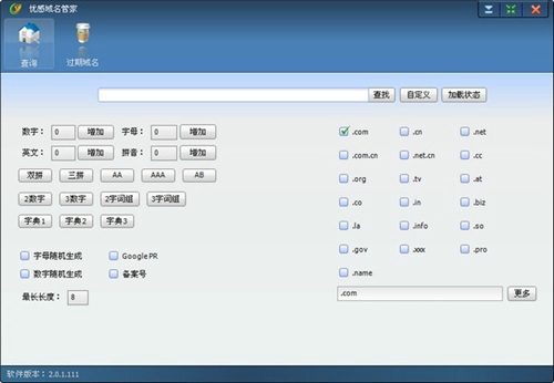 优感域名管家电脑版是一款快速、智能、高效的域名查询工具,优感域名管家最新版提供智能输入功能,支持词组、字母、拼音、数字、英语等多种组合方式进行域名查询,可以灵活选择查询方式,快速获取需要的域名结果。