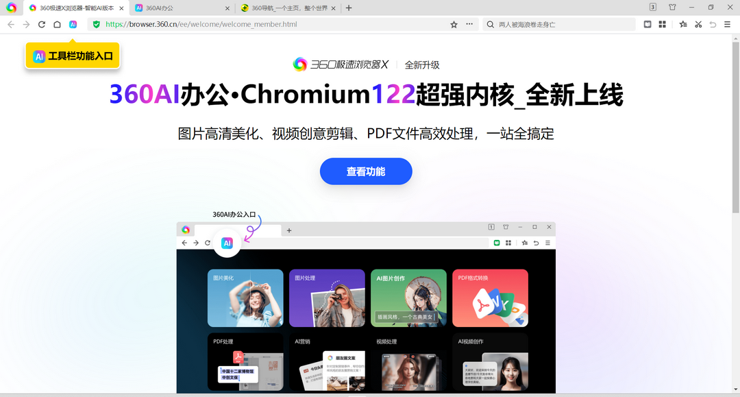 360极速浏览器X是360旗下采用超强内核Chromium122的强大浏览器,该浏览器功能不仅仅是在浏览网页上,更接近于一款办公软件,可以直接用来查看图片视频以及PDF文件,并且有着超强的ai功能,让用户可以轻松的完成办公需求。