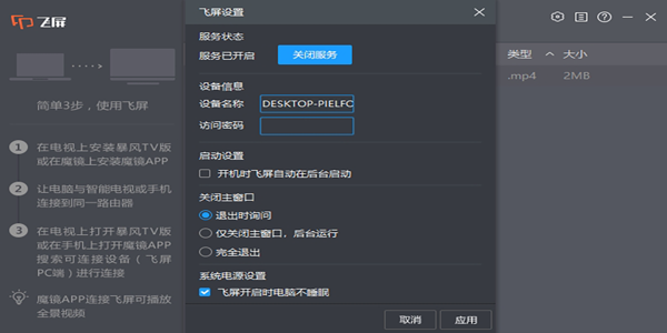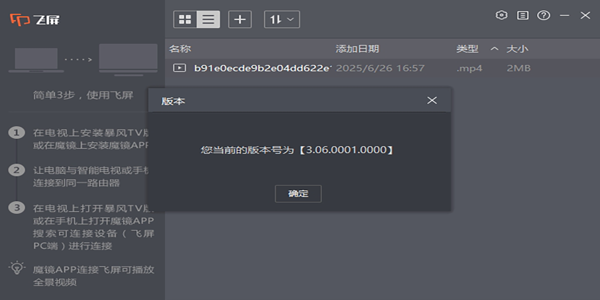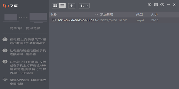暴风飞屏电脑版是一款功能强大的多媒体分享软件,暴风飞屏2026最新版能够帮助用户轻松地将电脑上的视频内容投屏到智能电视或其他投屏设备上,需要电脑与智能电视或电视盒子连接至同一路由器,即可轻松实现视频内容的投屏,支持多种视频格式播放,满足用户的不同需求。