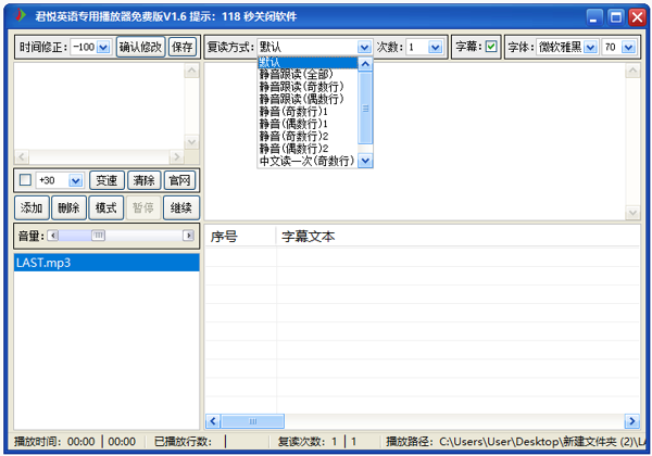 君悦英语专用播放器电脑版是一款专为英语学习设计的音频播放工具,君悦英语专用播放器PC版提供高质量的音频播放功能,支持多种音频格式,音频播放清晰流畅,用户可以在软件内进行随时暂停、重放、快进和倒退等操作,便于反复听取和练习。