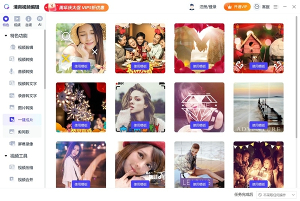 清爽视频编辑软件主题模板丰富多样,涵盖婚礼纪念、亲子时光、毕业季、节日祝福等全场景,预设转场与配乐,替换素材即可快速成片。