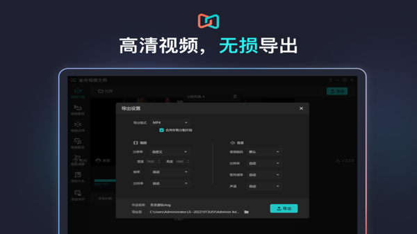 金舟视频大师软件能同步原视频的画质和帧率,实现无损高清导出,避免了剪辑后视频画面模糊、卡顿的问题。