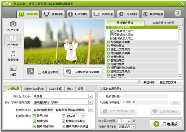 内置两百多种相片特效,涵盖 2D、3D 切换效果及通用转场,支持自动随机匹配或手动指定,持续更新扩充特效库。