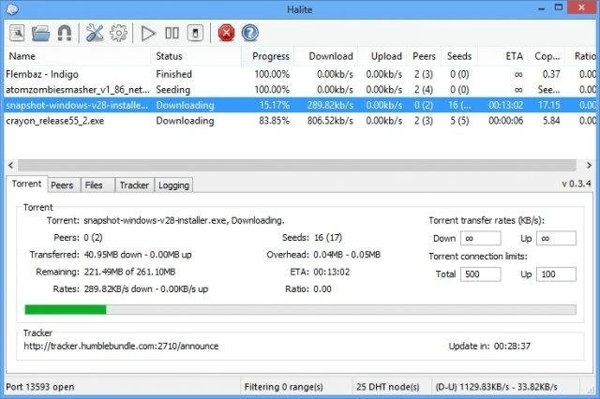 针对每个选定的种子,Halite 会提供详尽信息,如文件大小、已下载比例、下载速度、剩余时间等,助力用户清晰掌握下载进度与状态。