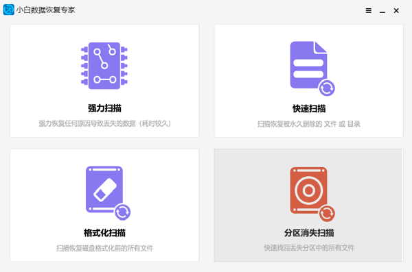 小白数据恢复专家是一款功能强大且易用的数据恢复工具,小白数据恢复专家2025电脑版支持各种存储设备的数据恢复,智能划分文件类型和路径进行分类,可以通过筛选、搜索等功能,在海量扫描结果中快速找到目标文件,效率极高。