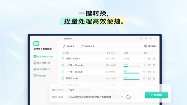 金舟电子书转换器app是一款功能强大的电子书格式转换工具,金舟电子书转换器最新版能够将不同格式的电子书进行快速精准的转换,帮助用户轻松在不同的电子书阅读设备和平台之间转换,方便用户随时随地在线阅读喜欢的书籍资源。