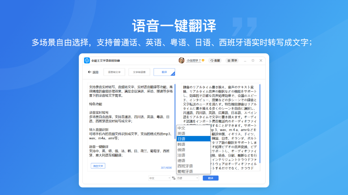 集成多国语言文本翻译能力,兼顾语音文字转换与跨语言翻译需求,适配跨境沟通、外文音频转写等场景,实现多语言内容高效处理。