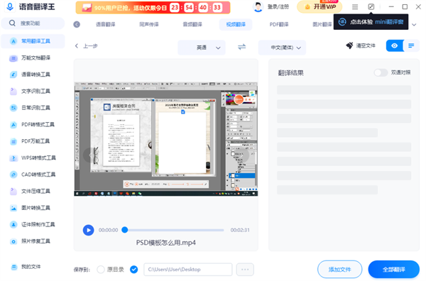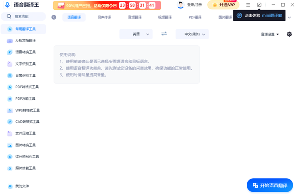 语音翻译王电脑版是一款多功能且高效的翻译软件,语音翻译王PC最新版支持同声传译功能,用户可以在进行对话或会议时,实时将语音翻译成文字,帮助用户实现流畅的沟通,还能够翻译各种文档,用户只需上传文档,软件即可快速提供翻译结果,支持的文件格式包括PDF、WPS、CAD等。