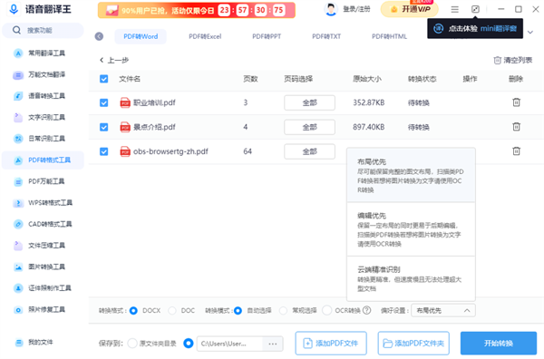 支持 PDF、WPS、CAD 等多种格式文件翻译,同时兼容 Word、图片等类型,批量导入文件可一键完成翻译,大幅减少重复操作。