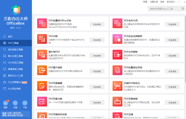 包含 19 种 PDF 专项功能,支持 PDF 与 Word/Excel/PPT 互转、合并分割、水印添加 / 移除、加密解密等操作,还能实现扫描 PDF 优化、偏斜纠正、图片批量抽取,满足 PDF 全流程处理需求。