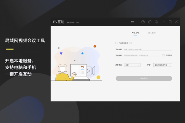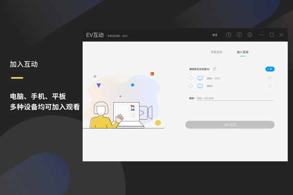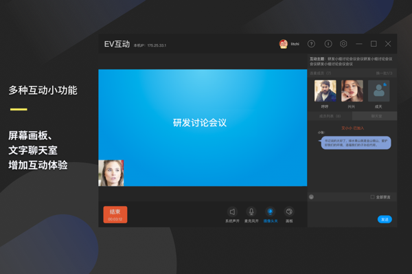 EV互动电脑版是一款专为企业设计的会议互动工具,EV互动PC客户端支持音频、视频、文字聊天等多种交互方式,一键操作,即可快速开启会议,参与者则可通过内网搜索轻松找到并加入会议,提供桌面画板等小工具,支持实时绘图、标注和演示,帮助与会者更直观地理解讨论内容。