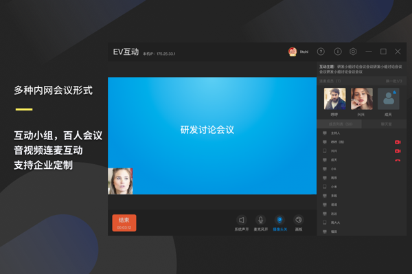 EV互动软件支持多人圆桌会议、部门小型沟通会、内部培训等多种企业会议场景,一套工具满足企业日常内部会议全需求。