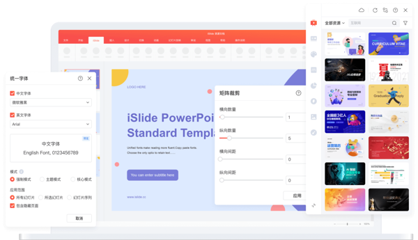 iSlide 拥有超 30 万套专业 PPT 模板,风格多元,涵盖商务、教育、科技、创意、中国风等,适用于工作总结、商业计划书、培训课件、节日庆典、竞聘述职、毕业答辩、发布会等各类场景。