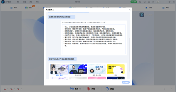 提供对演示风格和大纲更具体的智能提示,甚至可自动生成讲稿与内容框架,帮助用户快速理清思路,高效搭建演示核心骨架。