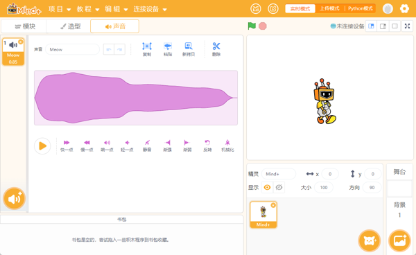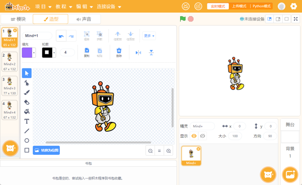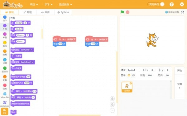 Mind+软件提供可视化编程语言,使用拖拽式编程,降低了编程的学习门槛,使孩子能够在直观的界面中理解编程逻辑,快速构建自己的项目。
