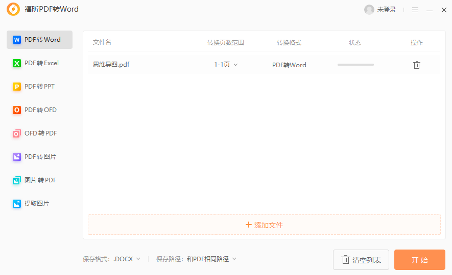 软件界面简洁,用户点击 “添加文件” 可单或批量导入 PDF,简单设置转换参数后,点击 “开始转换”,几步即可快速完成格式转换,操作轻松,提升工作学习效率。