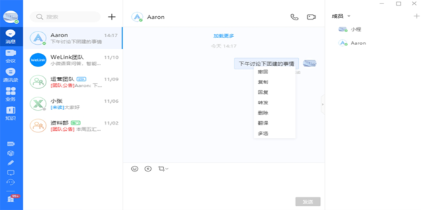 多样化沟通方式:支持文本、语音、图片、视频等多种消息类型,还能直接传输名片、云空间文件、邮件等,轻量化办公。