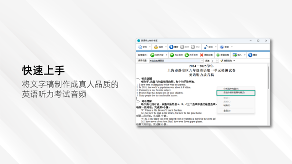 从文本导入、语音合成到音频试听、成品导出,一站式完成听力材料制作全流程,支持整段或指定段落试听,可即时核对效果并调整,避免无效操作,提升制作效率。
