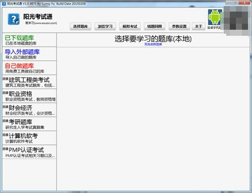 阳光考试通电脑版是一款简单好用的在线考试学习软件,阳光考试通PC客户端涵盖了建筑工程类、职业资格考试、财会经济等多个学科的题库,支持用户根据自身需要自由导入更多题库进行个性化学习,支持用户自主导入其他题库,满足不同学习需求和专业课程的需要。